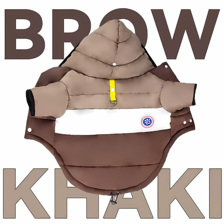 Comfort details matter: a hood that secures with snap buttons, an adjustable hem drawcord to block draughts, and a built-in D-ring so you can clip the lead in one motion. Front leg openings protect the chest while allowing natural movement. Finished with secure snaps and reinforced stitching.
